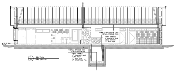- heat storage: Hydronic panels mounted on the building will harvest solar energy during the temperate seasons and store the energy as hot water for when it is needed in an underground 12,000-gallon super insulated thermal storage tank (already constructed under Phase 1). In addition, thermal mass building elements in the floor slab, and masonry stove help moderate the building temperature and provide additional thermal energy storage.
